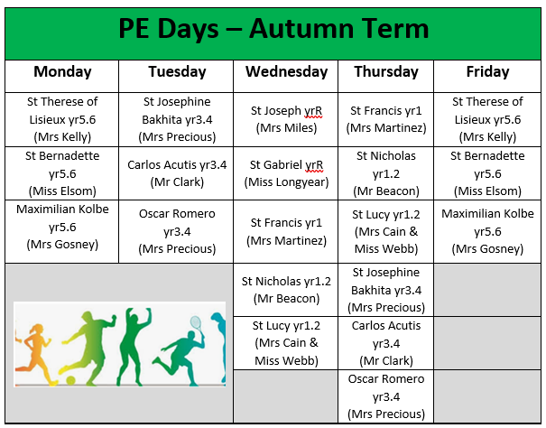 PE Days - Children should come dressed in their PE kits - green t-shirt and black shorts or black or green track suit and trainers. Track suits must be plain with no logos.