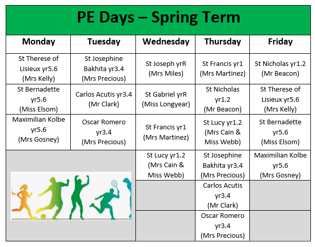 PE Days - Children should come dressed in their PE kits - green t-shirt and black shorts or black or green track suit and trainers. Track suits must be plain with no logos.
